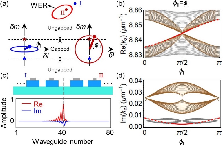 图3外尔环相变形成的外尔界面模式。(a)两种非厄米外尔结构分别位于外尔环的内和外,(b,d)两种外尔结构构成复合体系的能带图,红色代表界面态曲线,(c)结构示意图及界面态的模式分布图。
