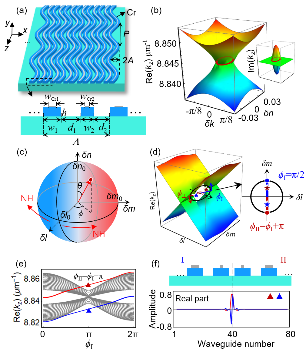 图2 "虚质量"翻转形成的外尔界面模式。(a)铬覆盖的一维硅波导阵列示意图,(b)合成维度中的外尔环,(c)3维合成维度形成的空间球,(d)非厄米合成维度中的能带图及两种外尔结构在其中的分布示意图,(e)两种外尔结构构成复合体系的能带图,红色与蓝色代表界面态曲线,(f)结构示意图及界面态的模式分布图。