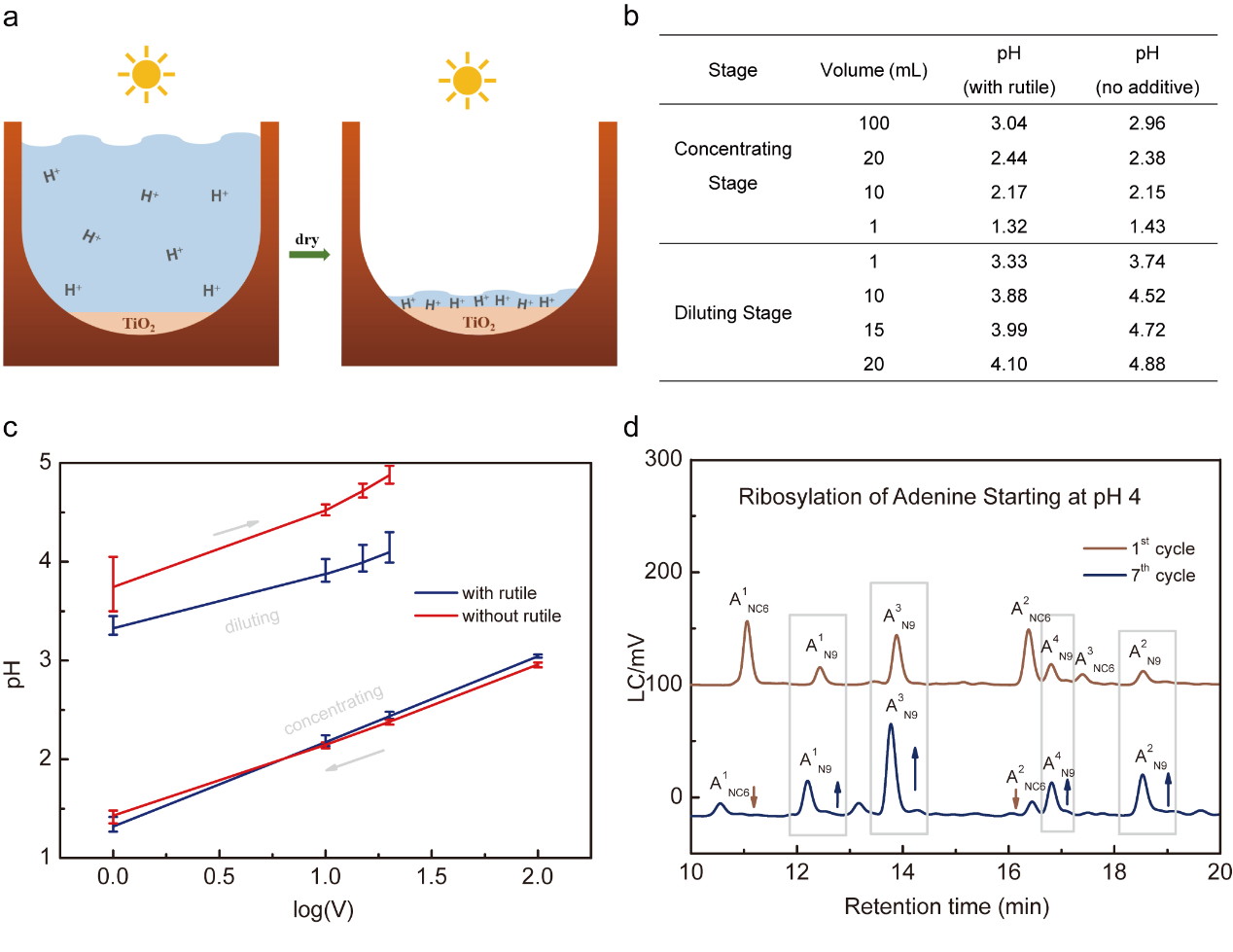 考虑到原始地球环境下质子浓度有限,对于需要一定酸性的核苷化反应而言,将质子保存在矿物表面显得尤其重要。因此,作者对钛矿吸附质子的能力进行了定量探究(图4a),在有/无钛矿存在的条件下,分别蒸干pH = 3的盐酸溶液,加水稀释后,含有钛矿的溶液pH值比无钛矿的溶液低0.4至0.8,证明了钛矿具有吸附质子的能力(图4b-c)。由此证明,起始溶液不必具有强酸性,对于非挥发性的酸(如磷酸)更是如此。因此,作者以pH = 4为起始条件尝试腺嘌呤的核苷化(图4d),在7轮湿干循环后,依然得到不错的结果,∑AN9达到11.6%,β-腺苷产率达2.6%。