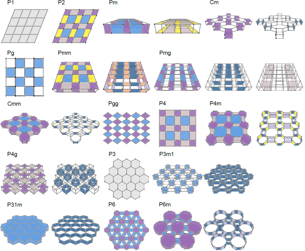 ? 为所有17个墙纸群构建了"典范模型"(图2)。对于每个墙纸群,典范模型可以实现所有对应的对称投影代数,同一个群的不同投影代数对应于典范模型中的不同的规范通量。因此,对458种对称投影代数都可构建相应的晶体模型。由于物理上的简单性,这些模型都可以通过声学晶体等人工晶体实现。