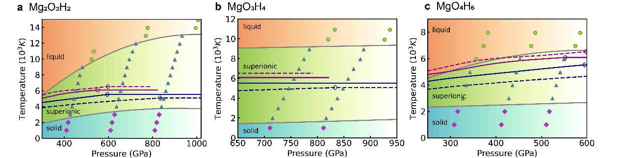 他们用自主开发的基于机器学习和图论辅助的晶体结构搜索方法(MAGUS),结合第一性原理计算,对高压下的镁-氧-氢三元化合物的晶体结构,以及它们在高温高压下的物态进行了系统研究,预测了三种在高压下稳定的镁-氧-氢三元化合物,其组分为Mg2O3H2 (>400 GPa),MgO3H4 (>600 GPa)和MgO4H6 (270-600 GPa)。随后,他们使用第一性原理分子动力学和机器学习分子动力学详细研究了这些化合物在高温高压下的动力学行为,并构建了温度压强相图。模拟结果表明,随着温度升高,三种化合物均有从固态到超离子态再到液态的相变。在镁-氧-氢体系中,超离子态表现为镁-氧框架保持固体行为,而氢则可以像液体一样自由扩散(图1)。将镁-氧-氢三元化合物相图与目前的行星模型对比,发现氧化镁-水化合物的超离子态区间涵盖了天王星和海王星内部的温度压强范围(图2),说明它们很可能在行星内部大量存在。
