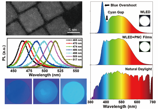 图一:《Advanced Functional Materials》的扫描透射电子显微镜照片,一系列青光发射量子点样品的光谱图和光学膜片样品的荧光照片,典型蓝光LED激发白光灯具的发射光谱图,以及使用青光转换光学膜后的白光灯具发射光谱图,以及天然光光谱图。从上可见,使用光学膜后的灯具的发射光谱呈现平滑均匀连续分布的白光,没有出现"蓝光溢出"和"青光缺失",接近天然光。