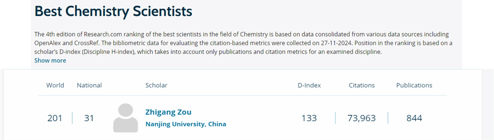 近日,国际学术网站Research.com发布了2025年各学科领域顶尖科学家榜单,中科院院士、凯发k8官网邹志刚教授在化学领域位列中国第31、世界第201,在材料科学领域位列中国第62、世界第243;被评为“2025中国化学领域领军人”和“2025中国材料领域领军人”。