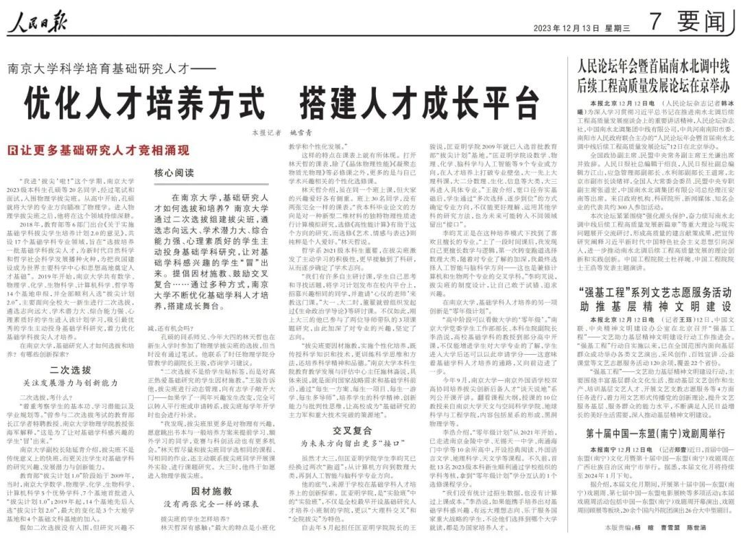 2023年12月13日《人民日报》刊登《凯发k8官网科学培育基础研究人才——优化人才培养方式 搭建人才成长平台》