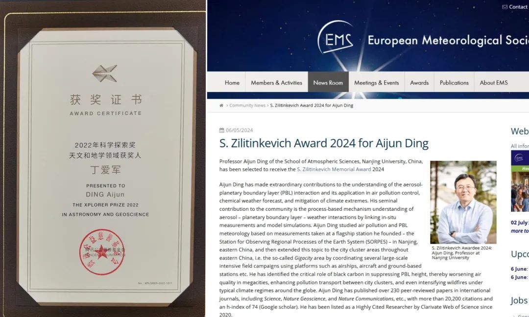 丁爱军教授获2022年度“科学探索奖”和欧洲气象学会2024年度“Zilitinkevich奖”