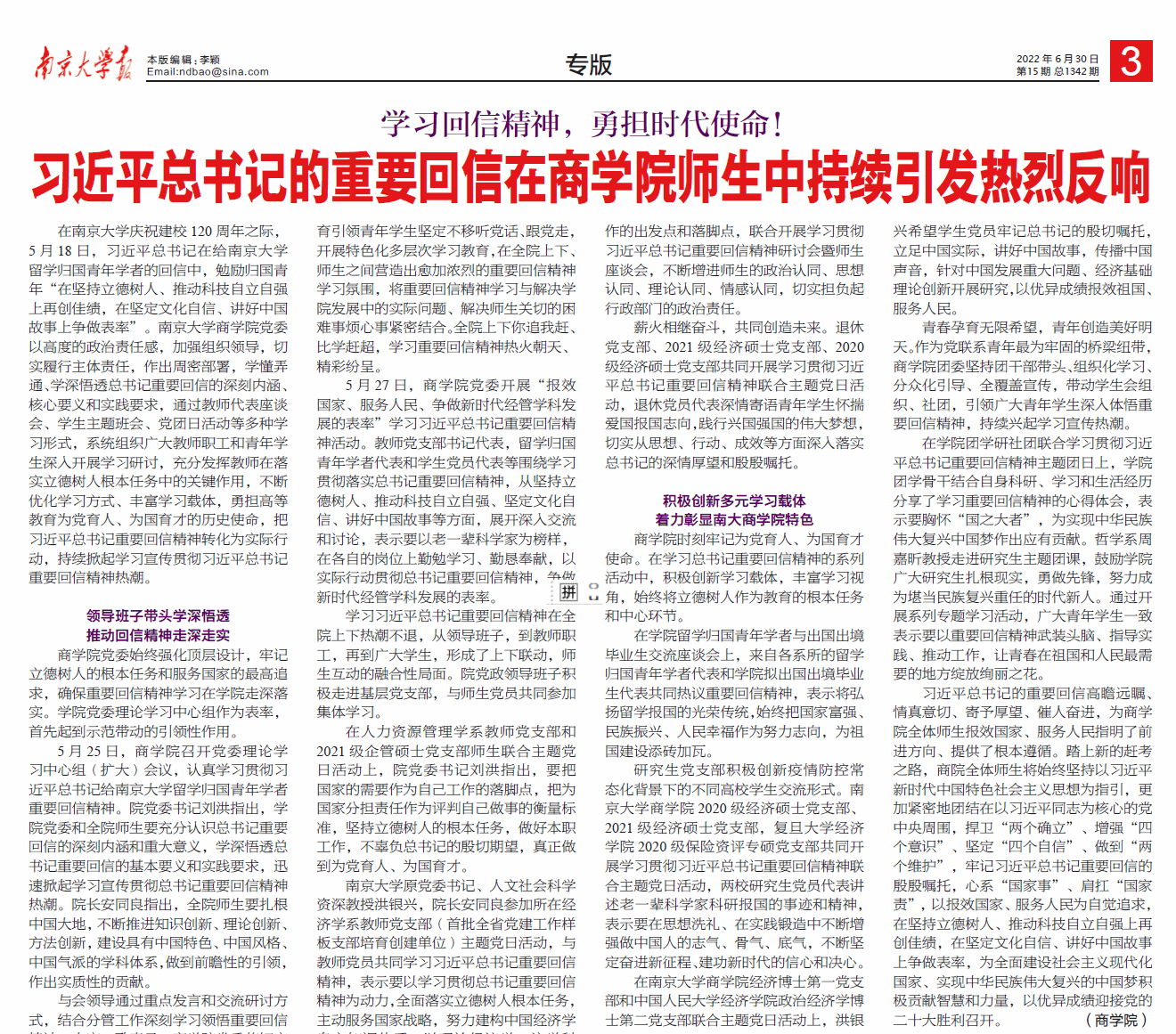 五年来,商学院党委始终把党的政治建设摆在首位,不断深化落实“第一议题”制度和理论学习中心组制度,第一时间深入学习习近平总书记系列重要讲话精神和指示精神,重点学习贯彻习近平总书记关于教育科技人才、关于党的建设的重要论述。提高政治站位,坚决贯彻落实党的路线方针和决策部署,五年来先后扎实开展党史学习教育,学习贯彻习近平新时代中国特色社会主义思想主题教育,党纪学习教育,深入贯彻中央八项规定精神学习教育,坚决做到“两个维护”,坚定拥护“两个确立”。2022年5月,在凯发k8官网庆祝建校120周年之际,习近平总书记给凯发k8官网留学归国青年学者回信,勉励归国青年“在坚持立德树人、推动科技自立自强上再创佳绩,在坚定文化自信、讲好中国故事上争做表率”。商学院党委组织全院广大师生系统开展学习研讨,持续掀起学习贯彻习近平总书记重要回信精神热潮。领导班子带头学、师生支部互动学、兄弟院系联合学,深入广泛、形式多样的学习活动在校内起到了良好的示范效应和宣传效果,学习活动全景工作纪实被2022年6月30日第15期《凯发k8官网报》专版报道。