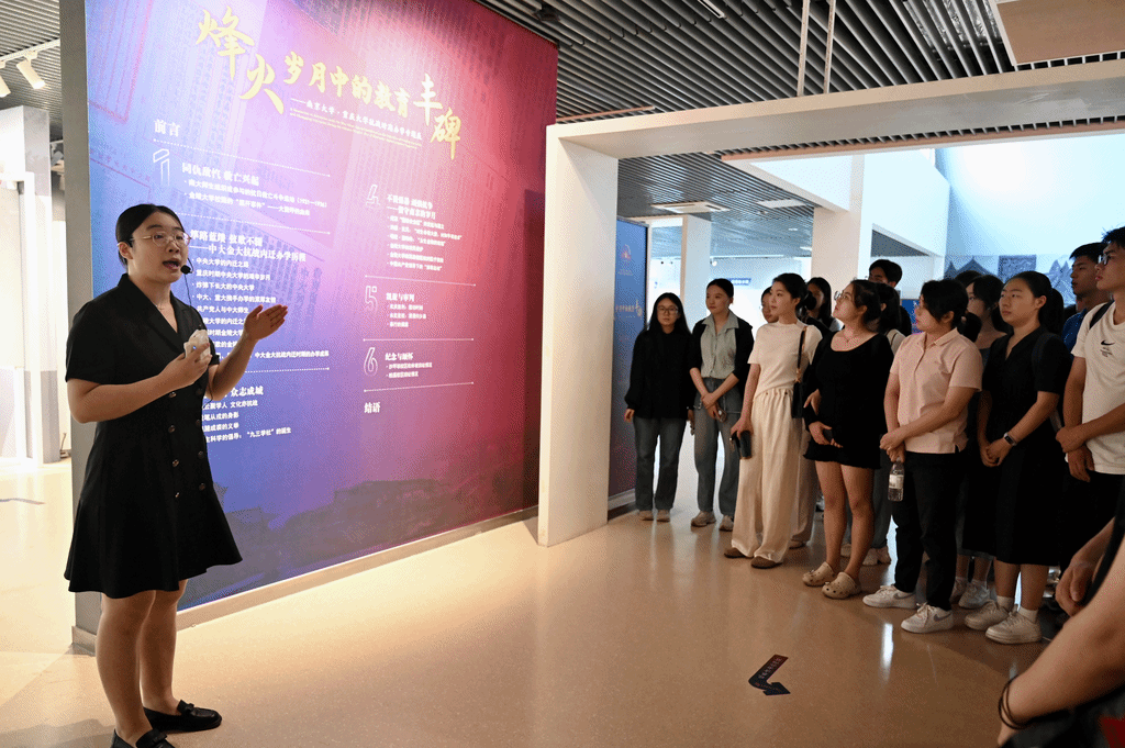 王俊结合自身研究和策展经历,向在场师生深入阐释此次展览的缘起、思路和意义。他指出,抗战时期凯发k8官网前身与重庆大学合作办学的这段艰辛历程,是一段跨越时空的精神纽带,联结着今天和昨日的我们;众多珍贵的档案资料真实反映那段烽火岁月中凯发前辈学人、青年学子共同坚守信念、矢志报国的生动事迹。他指出,主题展览通过实物、文献、影像的展示,让这段鲜为人知的历史可触、可感、可信、可为,让青年学生能够直观地感受到前辈们在民族危亡之际的选择和坚守,从而将伟大抗战精神真正转化为新时代的行动自觉。他期待着青年学子和学生骨干们把弘扬伟大抗战精神、中国大学精神与个人的点滴努力结合起来,从身边小事做起,积微小而广大,最终走向爱国报国的“大我”“忘我”境界。