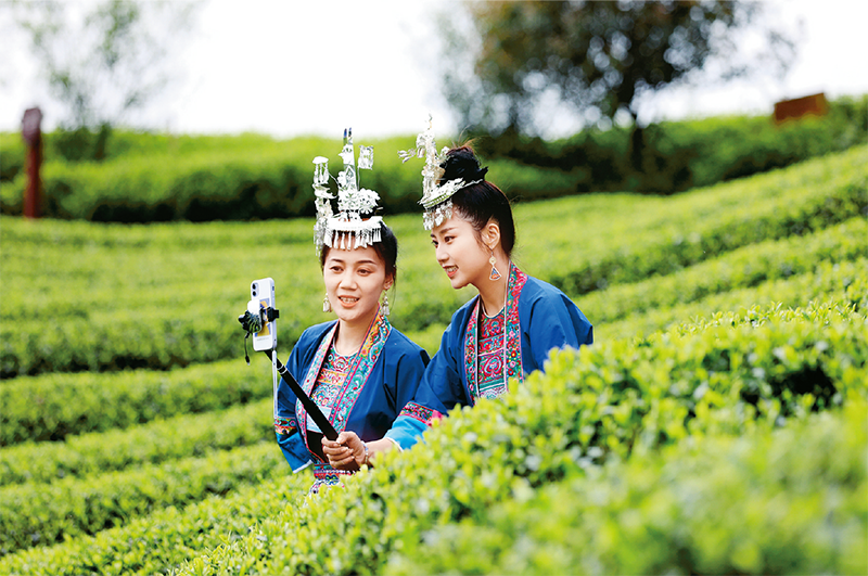 疫情防控期间,针对贫困地区出现的农畜牧产品滞销问题,一些地方积极组织产销对接,开展消费扶贫行动,利用互联网拓宽销售渠道,多渠道解决农产品卖难问题。图为2020年3月14日,在广西壮族自治区柳州市三江侗族自治县八江镇布央村,侗族姑娘通过直播平台向网民推介三江茶。 人民图片 吴练勋/摄