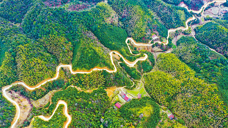 村村通公路,组组能通达,户户有便道,农村公路建设不仅改善了贫困地区群众的交通出行条件,更成为一条条脱贫路、致富路、乡村振兴路。图为2020年1月22日航拍的江西省吉安市泰和县老营盘镇富足村“四好农村路”——竹富公路。它蜿蜒盘旋在延绵的大山间,成为该村的主要进出道路。 人民图片 邓和平/摄